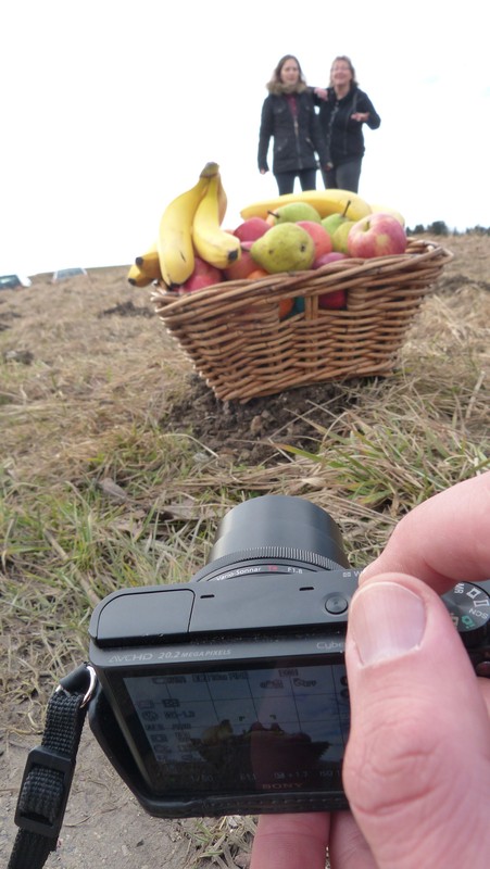 Wird nun für das Foto ein geeigneter Aufnahmewinkel gewählt, so scheinen die Akteure als Zwerge mitten im Obstkorb zu sitzen. Wichtig ist dabei, dass sowohl der Obstkorb als auch die Akteure scharf abgebildet werden. Hier haben Smartphonekameras und kleine Kompaktkameras durch ihre große Tiefenschärfe (die dem kleinen Aufnahmesensor geschuldet ist) sogar einen großen Vorteil im Vergleich zu professionellen Geräten, bei denen man versuchen muss, durch Abblenden eine große Tiefenschärfe herzustellen.