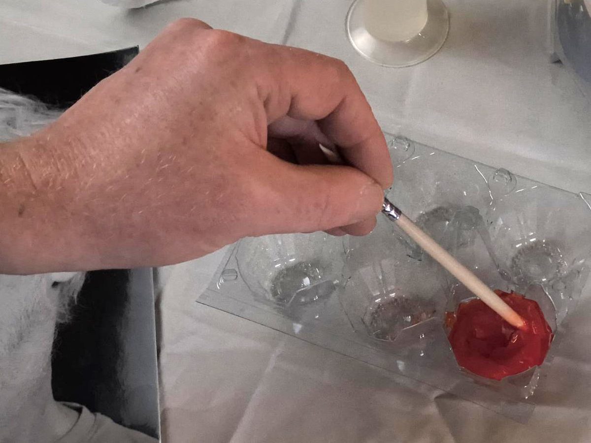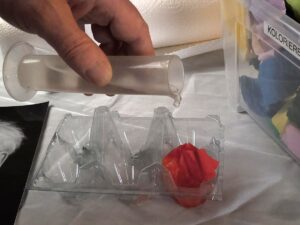 Stelle mehrere kleine Behälter mit Wasser bereit. Sehr gut eignen sich Eierschachteln aus Plastik. Jede Farbe sollte ein eigenes Wasserbad haben, damit die Farben sich nicht vermischen.