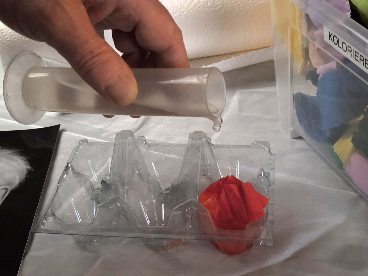 Eine besonders unkomplizierte und kostengünstige Methode ist das Kolorieren mit aufgelöstem buntem Krepppapier. Diese Technik ist leicht zu erlernen, verzeiht auch Anfängern kleinere Fehler und ermöglicht wunderbar leuchtende, gleichzeitig aber auch zarte Farbtöne.